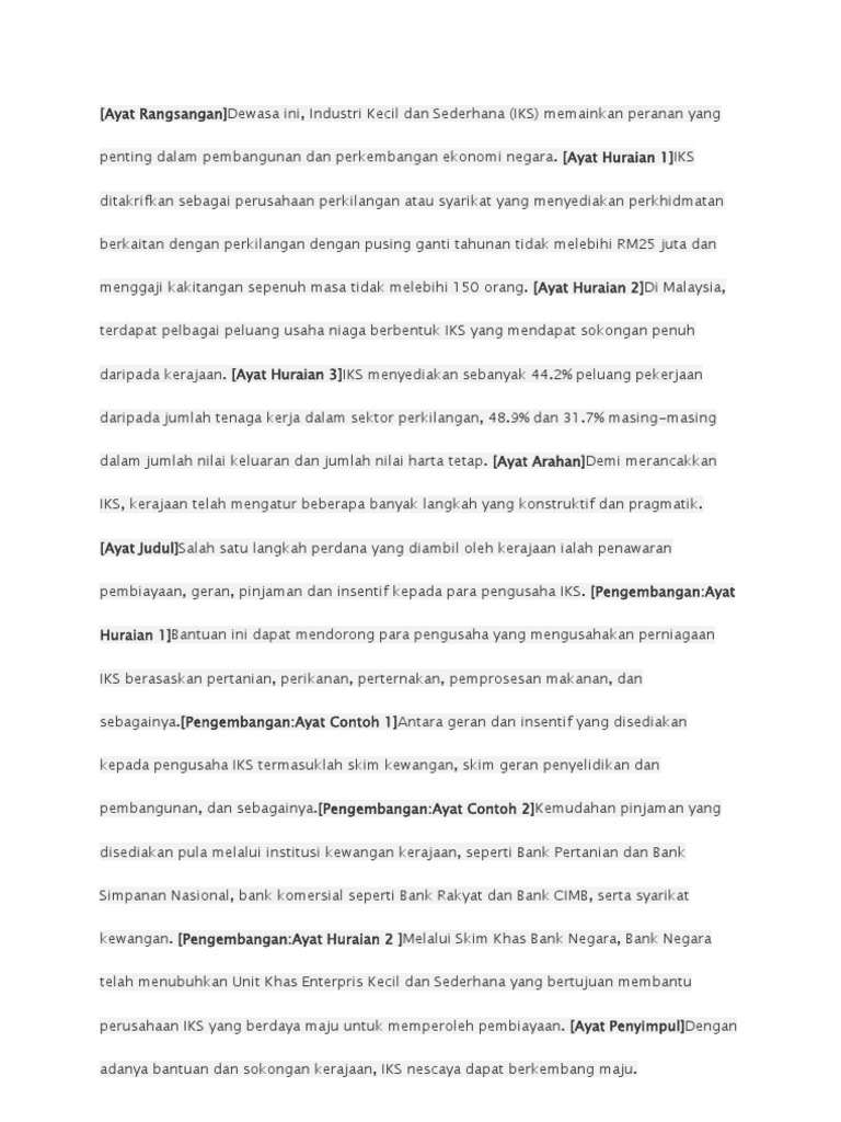 Ayat topik perlu disokong oleh ayat huraian yang terdiri daripada isi sokongan. CIRI-CIRI MURID CEMERLANG Akademik Kepimpinan. PengembanganAyat Contoh 2Antara program yang ditawarkan ialah latihan keusahawanan skim latihan perintisan dan program promosi pemasaranAyat PenyimpulMelalui agensi-agensi kerajaan IKS berdaya maju dan.